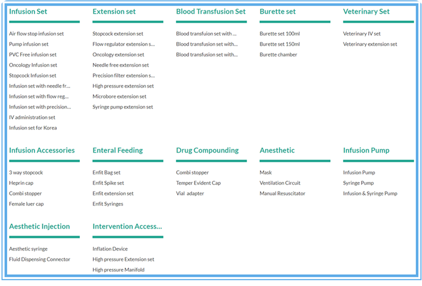 2. 組件產品 : 滴注腔,過濾器,尖峰,夾鉗和流量調節器,閥門,注射部位,魯爾鎖,蓋和蓋,ENFit連接器,旋塞閥